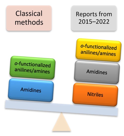 Moreover, quinazolines are employed as fragments in the functionalized materials [33] and also serve as useful intermediates in fine chemicals [34]. Owing to this biologically active legacy, quinazolines have emerged as synthetic targets in the last few decades. The first example of the synthesis of quinazolines from cyanogen and anthranilic acid was reported by Griess in 1869 [35]. Consequently, several protocols have been developed since then [36,37,38,39]. Recently, transition-metal-free reactions have received considerable attention and are recognized as an indispensable tool in organic synthesis, as they are not only cost-effective but also environmentally friendly. The metal-free methodology compliments metal-mediated reactions by eliminating expensive metal complexes and toxic metal contamination [40]. There are two classical strategies for the construction of the quinazoline skeleton under metal-free conditions: (i) substituted quinazolines can be prepared from easily available ortho-functionalized anilines such as 2-aminobenzylamines and 2-aminobenzoketones; (ii) using N-arylamidines as a substrate, quinazoline derivatives have been developed, in which pre-activation at the ortho-position of the N-aryl ring is not necessary (Figure 2).