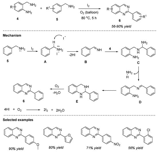 Likewise, Bhanage et al. (2016) disclosed a green and sustainable method for the construction of 2-arylquinazolines 6 from 2-aminobenzylamine 4 and N-mono substituted benzylamines 5 in the presence of molecular iodine at 80 °C for 5 h under O2 balloon (Scheme 2) [56]. The optimized reaction conditions worked well for a variety of substrates including electron-donating and electron-withdrawing groups and provided quinazolines 6 in 56–90% yields. Additive-free, solvent-free, transition-metal-free, utilizing oxygen as the green oxidant, shorter reaction times, and simple operation conditions are the major benefits of this approach.