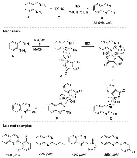 In the same year, Sen et al. (2016) developed the facile synthesis of quinazolines through the o-iodoxybenzoicacid (IBX)-mediated reaction of 2-aminobenzylamine 4 and aldehydes 7 in acetonitrile at room temperature for 6 h (Scheme 3) [57]. Various aryl, heteroaryl, and alkyl aldehydes 7 could be transformed to the corresponding 2-substitued quinazolines 8 in 55–94% yields.