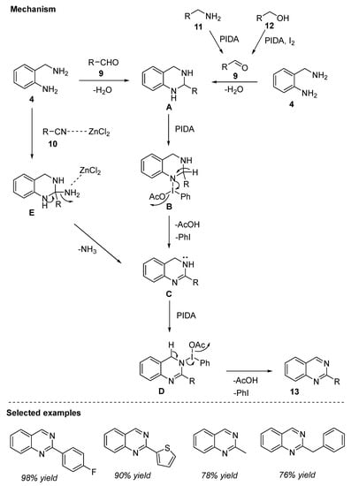 The proposed mechanism as depicted in Scheme 5 suggested that the reaction between 2-aminobenzylamine 4 and aldehyde 9 resulted in the generation of intermediate A. A upon reaction with PIDA led to the formation of intermediate B. Elimination followed by the attack with another molecule of PIDA afforded the desired product via intermediates C and D. Oxidation of arylamine 11 and arylalcohol 12 derivatives in the presence of PIDA and PIDA/I2, respectively, generated the corresponding aldehydes 9. Aldehydes 9 then underwent a similar course of mechanism to furnish quinazoline 13. In the case of nitriles 10, coordination of ZnCl2 with the cyano group [60] provided the intermediate E, which then liberates ammonia in the presence of ZnCl2 to form intermediate C. Quinazoline 13 is formed in the subsequent steps by following a similar mechanism as detailed earlier.