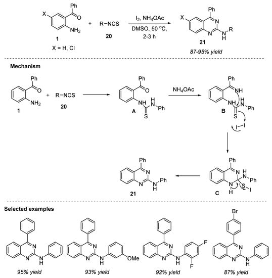 Palakodety et al. (2019) reported the metal-free protocol for the construction of N,4-disubstituted quinazolin-2-amine 21 from 2-aminobenzophenone 1, phenylisothiocyanate 33, and ammonium acetate as the nitrogen source in the presence of iodine in dimethylsulfoxide at 50 °C for 2–3 h (Scheme 9) [65]. Under the optimized conditions, a wide range of electron-donating and electron-withdrawing groups present on isothiocyanate 20 and 2-aminobenzophenone 1 offered the corresponding N,4-disubstitued quinazolin-2-amines 21 in 87–95% yields. Moreover, meta and ortho-substituted 2-aminoaryl ketones 1 did not tolerate the established conditions due to the steric effect and this remains a drawback to this strategy. Readily available inexpensive substrates, operational simplicity, shorter reaction times, and excellent yields are the key benefits of this methodology.