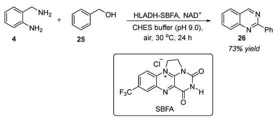 Among the biological cascade systems, chemoenzymatic synthesis methods have drawn considerable attention by the integration of biocatalysis with the versatile reactivity of chemocatalysis [70]. Noteworthy advantages of the chemoenzymatic cascade process include: cost-effectiveness, simple operation conditions, improved selectivity, omitting isolation and purification of intermediates, lower waste generation, and higher reaction yields. In this connection, Zhu et al. (2022) reported the first example of the chemoenzymatic synthesis of quinazolines [71]. The condensation reaction of 2-aminobenzylamine 4 and benzyl alcohol 25 in the presence of the HLADH-SBFA catalytic system and maintaining the pH 9.0 by CHES buffer, under air at 30 °C for 24 h, furnished 2-phenylquinazoline 26 in 73% yields (Scheme 12). In this reaction, synthetic bridged flavin analog (SBFA) performed regeneration of both NAD(P)+ and the cofactor during the alcohol dehydrogenase (ADH)-catalyzed process of alcohol to aldehyde. HLADH was used as a biocatalyst and SBFA served as a bifunctional chemocatalyst. Mild reaction conditions, employing bifunctional organocatalyst SBFA, and utilizing O2 as an external oxidant, serve as a green and sustainable alternatives in this strategy.