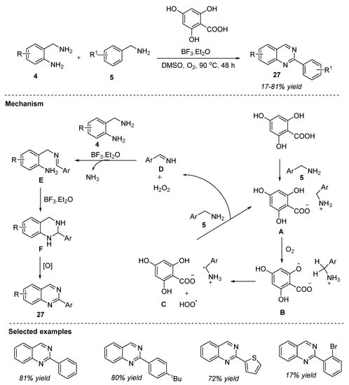 The organocatalytic oxidative reaction mechanism was depicted in Scheme 13. In the first step, benzylamine 5 reacted with 4,6-dihydrosalicyclic acid to form salt A which generated aryloxy radical B and HOO• via hydrogen abstraction by O2. In the next step, intramolecular hydrogen abstraction of the benzyl group led to the formation of radical cation C [73], which then gave imine D under the action of HOO•. Imine D then underwent an amino group exchange reaction with 2-aminobenzylamine 4 in the presence of BF3.Et2O to generate intermediate E. Later, F was formed by the intramolecular cyclization of E, enhanced by BF3.Et2O. In the last step, oxidative aromatization of F delivered the desired product, 2-arylquinazoline 27.