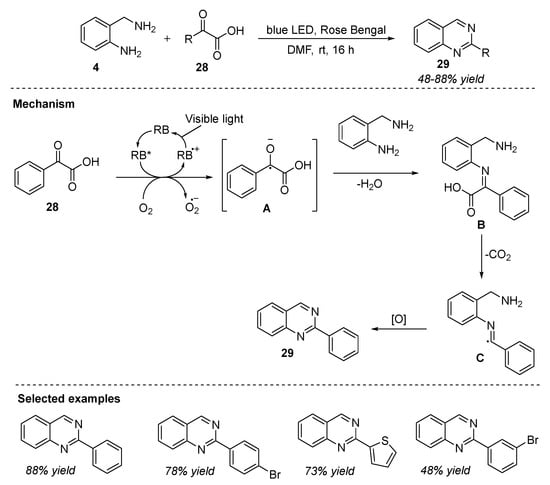 The reaction mechanism proposed by the authors was shown in Scheme 14. Initially, benzoylformic acid 28 reacted with excited Rose Bengal under blue-light irradiation to generate anion intermediate A, which then dehydrates with 2-aminobenzylamine 4 to give another intermediate B. Then, B undergoes decarboxylation to yield free radical intermediate C, followed by oxidation and cyclization which furnished quinazoline 29.