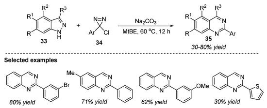 An interesting approach was developed by Levin et al. (2022) for the construction of quinazoline scaffolds by the selective cleavage of the N-N bond of the indazole core 33 [79]. This chlorodiazirine-34-mediated reaction provides unified access to quinazolines 35 in the presence of sodium carbonate and methyl tert-butyl ether (MtBE) at 60 °C for 12 h (Scheme 17). Indazoles 33 were tolerant towards a wide range of alkyl substitutions. Moreover, free alcohol, thiophene, and halogen groups substituted in various positions also gave quinazolines 35 in 30–80% yields. The two major limitations associated with this strategy include: (a) substrates with less solubility in refluxing MtBE displayed poor reactivity, and (b) nucleophilicity of diazole was deactivated due to inductive withdrawal and precludes productive reactivity.