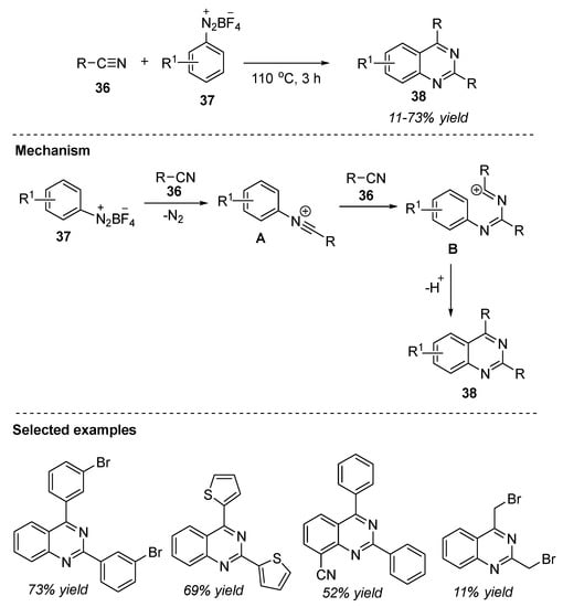 Liu et al. (2017) reported a (2+2+2) modular synthesis of multi-substituted quinazolines by the direct reaction of two equivalents of nitriles 36 with aryldiazonium salts 37. The reaction of nitriles 36 and aryldiazonium tetrafluoroborate 37 at 110 °C for 3 h provided quinazolines 38 in 11–73% yields (Scheme 18) [80]. Under the optimized conditions, several aryldiazonium tetrafluoroborates 37 with electron-donating and electron-withdrawing groups at different positions in the ring were reacted smoothly to afford the corresponding products 38. Similarly, ortho- or para-substituted phenyldiazonium salts 37 gave quinazolines in good yields with the exception of nitro substituent. Moreover, aliphatic, aromatic, and heteroaromatic nitriles 36 served as suitable substrates for this annulation. Readily available substrates, shorter reaction times, one-pot, neat and metal-free conditions, gram-scale synthesis with 74% yields, flexibility in substitution patterns, atom-efficient, and easy handling procedures are the benefits of this strategy.