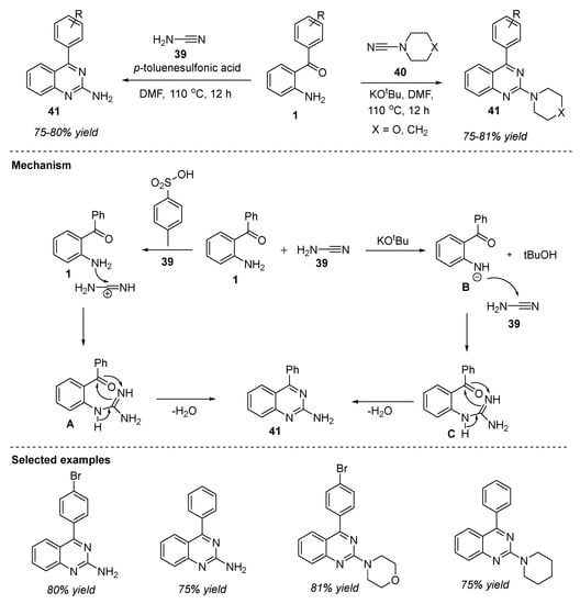 North et al. (2017) reported a metal-free oxidative annulation reaction for the synthesis of 2-aminated quinazolines 41 by the reaction of 2-aminobenzophenone 1 with unsubstituted cyanamide/4-morpholinecarbonitrile 39/40 in the presence of p-toluene sulfonic acid (PTSA)/potassium tertiary butoxide (KOtBu) in DMF at 110 °C for 12 h (Scheme 19) [81]. The reaction proceeded with a variety of strong electron-withdrawing and unsubstituted aromatic rings to deliver quinazolines 41 in 75–81% yields. The plausible reaction mechanism for the construction of 2-aminoquinazolines 41 mediated by an acid or base is shown in Scheme 19. The initial step is the protonation of nitrogen in the cyano group of 39 by the weak acid PTSA resulting in the increased electrophilic nature of the cyanamide carbon [82]. In the next step, amine 1 attacks the electrophilic carbon generating the intermediate, amidine A. Simultaneous cyclization followed by elimination of the water molecule from intermediate A delivered the product 2-aminoquinazoline 41. On the other hand, base-mediated proton removal of amine 1 led to the formation of a strong nucleophile B which then reacts with the cyanamide carbon 39 followed by ring closure, resulting in the formation of the desired product 41.