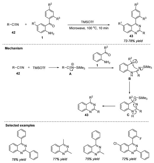 In the recent years, reports have shown that the treatment of amines with nitriles in the presence of Lewis acids such as trimethylsilyl iodide (TMSI) led to the in situ generation of amidines [83]. In this regard, Pahari et al. (2018) disclosed the synthesis of 2,4-disubstituted quinazolines 43 in 72–78% yields by the reaction between nitriles 42 and 2-aminobenzophenone 1 in the presence of the TMSOTf catalyst under microwave irradiation at 100 °C for 10 min (Scheme 20) [84]. Nitriles 42 activated by the Lewis acid catalyst, TMSOTf, were used as the nitrogen source in this reaction. The significant features of this approach include: single-step, mild and solvent-free conditions, in situ generated amidines, broad substrate scope, one-pot, and shorter reaction times. The reaction mechanism as illustrated in Scheme 7 involves the activation of electron-rich nitriles 42 by coordination with TMSOTf. Later, the nucleophilic attack of amine 1 onto the activated nitrile A generated an amidine intermediate B which then attacks the carbonyl to deliver quinazoline 43 via aromatization.