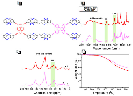 As shown in Scheme 1, Py-BSU CMP (Scheme 1a) and TBN-BSU CMP (Scheme 1b) were prepared by reacting BSU-Br2 with Py-T and TBN-T in a mixture of DMF/Et3N for 3 days to afford dark red powder for Py-BSU CMP and yellow solid for TBN-BSU CMP. The solubility test in different organic solvents (NMP, DMSO, DMF, MeOH, EtOH, DCM, and THF) revealed the insolubility of these materials compared to their corresponding monomers (BSU-Br2, Py-T, and TBN-T) and confirmed that both BSU-CMP frameworks had a high cross-linking density. The chemical characteristics of Py-BSU and TBN-BSU CMPs were identified by Fourier transform infrared spectroscopy and solid-state 13C nuclear magnetic resonance spectroscopy (ssNMR). A schematic of the corresponding structure is shown in Figure 1a. The absorption bands in Py-BSU CMP and TBN-BSU CMP around 3070 and 1580 cm−1 in the FTIR profiles (Figure 1b) measured at room temperature revealed the stretching of C-H and C=C in aromatic units, and the stretching absorption band of the C≡C bond appeared at 2200 cm−1. The appearance of absorption bands centered at 1167 cm−1 for Py-BSU CMP and 1177 cm−1 for TBN-BSU CMP corresponds to the SO2 unit in their framework (Figure 1b). The broad peaks at 95–115 ppm in the ssNMR spectra (Figure 1c) represent the signals of aromatic carbon atoms in the Py-BSU CMP and TBN-BSU CMP structures. Internal -C≡C- units in both Py-BSU CMP and TBN-BSU CMP were centered at 74.80 and 64.04 ppm, respectively [75,76,77]. The above results confirmed that Py-BSU CMP and TBN-BSU CMP were successfully constructed through a coupling reaction. In addition, the thermogravimetric analysis (TGA) in Figure 1d and Table 1 demonstrates the good thermal stability of the BSU-CMP materials under a nitrogen atmosphere, which is due to the high degree of cross-linking of the BSU-CMP materials after the Sonogashira cross-coupling reaction. The 5% weight loss (Td5) of Py-BSU CMP and TBN-BSU CMP occurred at 320 and 338 °C, 10% weight loss (Td10) of Py-BSU CMP and TBN-BSU CMP occurred at 383 and 386 °C, respectively, and the char yields at 800 °C were 48 and 56 wt%, respectively.