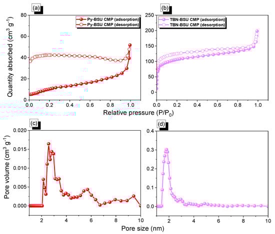(a,b) N2 adsorption/desorption isotherms and (c,d) pore size distribution profiles of (a,c) Py-BSU CMP and (b,d) TBN-BSU CMP.
