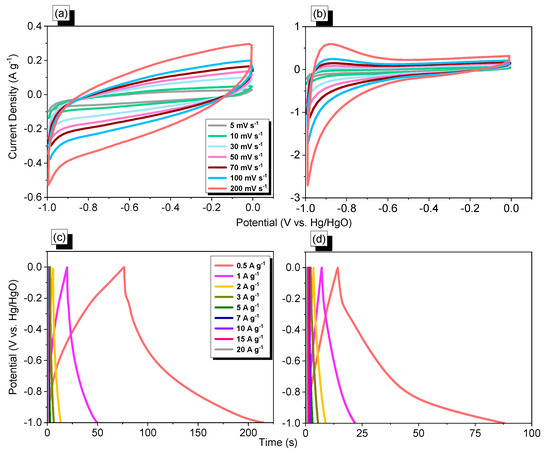 We used 1 M KOH aqueous solution as the electrolyte in a three-electrode system and compared the electrochemical performance of Py-BSU CMP and TBN-BSU CMP by cyclic voltammetry (CV) and galvanostatic charge–discharge (GCD). The working electrode, counter electrode, and reference electrode of the three-electrode system are composed of glassy carbon, platinum, and Hg/HgO, respectively. The CV curves of Py-BSU CMP and TBN-BSU CMP at scan rates from 5 to 200 mV s−1 are shown in Figure 5a,b, and the overall leaf-like shape suggests a response originating from the electric double-layer capacitance (EDLC). Among them, as the scan rate increased from 5 to 200 mV s−1, the maintained shape of the CV curves indicates the excellent rate capability of the material. Figure 5c,d report the GCD curves detected at current densities ranging from 0.5 to 20 A g−1. Slightly curved triangles are characteristic of EDLC.