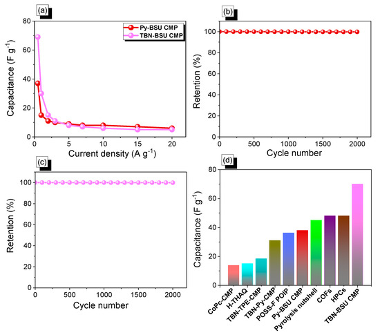 As shown in Figure 6a, at a current density of 0.5 A g−1, the specific capacitance values of Py-BSU CMP and TBN-BSU CMP calculated by GCD curves were 38 and 70 F g−1. In contrast, TBN-BSU CMP exhibited superior electrochemical behavior due to the more extended conjugated structure of the TBN unit and high surface area. The improvement of the π system increased the charge transfer efficiency in contact with the electrolyte and further promoted the performance of the supercapacitor through this process. From another point of view, the capacitance value shrunk when the current density increased from 0.5 to 20 A g−1. This can be attributed to the diffusion problem caused by electrolyte ions not fully permeating into the electrode material due to insufficient time in the high current environment. Figure 6b,c demonstrate the measured stability over 2000 cycles at a current density of 10 A g−1. The capacitance retention rates of Py-BSU CMP and TBN-BSU CMP were 99.8% and 99.9%, respectively. The extremely small capacitance decay indicates that the material has excellent electrochemical reversibility. Figure 6d shows that the specific capacitance value of TBN-BSU CMP precursor (70 F g−1) is higher than CoPc-CMP (13.8 F g−1) [78], H-THAQ (15 F g−1) [79], TBN-TPE-CMP (18.45 F g−1) [32], TBN-Py-CMP (31 F g−1) [32], POSS-F-POIP (36.2 F g−1) [31], Py-BSU CMP (38 F g−1), pyrolysis nutshell (45 F g−1) [80], COFs (48 F g−1) [81], HPCs (48 F g−1) [82], TBN-BSU CMP (70 F g−1), and other candidate materials.