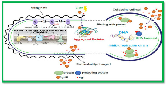 Numerous investigations have thus far supported AgNPs’ potent antibacterial action. Staphylococcus aureus, Pseudomonas aeruginosa, Escherichia coli, Bacillus subtilis, Vibrio cholera, Salmonella typhus, Enterococcus faecalis, Klebsiella sp., Listeria sp., and Acinetobacter sp. have all been found to be killed by AgNPs. AgNPs’ antibacterial mechanism is still up for debate. However, its antibacterial mechanism can be broken down into six categories: inhibition of the bacterial respiratory chain interference with protein synthesis and folding induction of bacterial genetic toxicity; induction of photocatalytic protein destruction and cell membrane rupture; and induction of the bacterial oxidative stress reaction to produce reactive oxygen species [17]; the mechanism of the silver nanoparticles’ antibacterial mechanism has been illustrated in Figure 1. Bacterial cell membranes can be destroyed by silver ions, which can also stop the respiration of bacteria. According to a study, silver has a stronger bactericidal effect in the nanoscale state because it may connect with the DNA in the cell membrane and stop the replication of the genetic material in bacterial cells [1]. Gram-negative bacteria were resistant to the AgNPs (15–25 nm; MIC: 16–128 g/mL), but not Gram-positive strains (15–25 nm; MIC: 256 g/mL) [18]. It is significant to note that, except for vancomycin against anti-microbial resistant bacterial strains, co-exposure to combinations of AgNPs and antimicrobial drugs, such as kanamycin, colistin, rifampicin, and vancomycin, demonstrated synergy against both wild-type and anti-microbial resistant K. pneumoniae isolates [19,20].