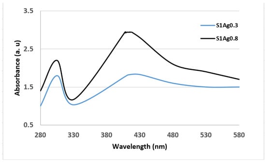 In addition, as shown in Figure 3, according to FTIR data, the spectrum of AgNPs loaded in S1Ag0.3 and S1Ag0.8 showed an absorption peak at 428 nm, which was due to the AgNP-localized surface plasmon resonance [20]. In S1Ag0.3 hydrogel, a broad absorption peak of AgNPs was formed at low AgNP concentration, whereas S1Ag0.8 revealed that increasing AgNP concentration resulted in more acute absorption. The distribution of AgNPs in S1Ag0.8 hydrogel was higher than in S1Ag0.3 hydrogel [22].