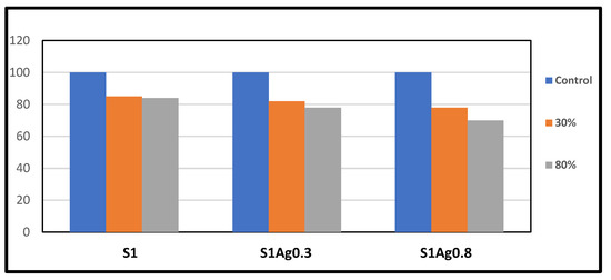 Cytotoxicity tests from MTT assay of the cell viability, detection of the toxicity of S1, S1Ag0.3, and S1Ag0.8. Absorbance was normalized to that of the negative control at each time interval and was considered 100%. The data are presented as the mean ± standard deviation (n = 5).