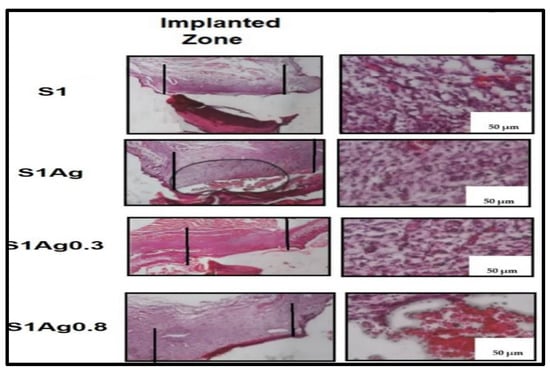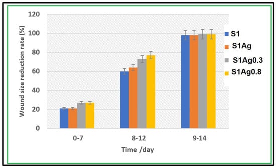 Silver ion release rates were higher in S1Ag0.3 than in S1Ag0.8 for nearly 24 h. After 24 h, no significant change was observed. This implies that the concentration of AgNPs should be higher in order to claim active antibacterial activity. The hydrogel polymer nanocomposite antimicrobial activity of each sample for Gram-negative strains and Gram-positive strains (E. coli and S. aureus) is shown in Figure 5. The inhibition zone diameter for all samples demonstrates that both Gram-negative and Gram-positive strains were significantly inhibited. The silver release rate from S1Ag0.3 and S1Ag0.8 hydrogels was determined using the F12 medium and AAS. For S1Ag0.3 hydrogels, the amount of silver ions released was 5.9 μg/mL within the first 6 h and quickly increased to 13 μg/mL for the next 7 h. The release rate increased from 12 to 24 h, reaching 18 μg/mL. The release rate then increased slightly after the first 24 h, reaching 19 μg/mL after 48 h. For S1Ag0.8 gel, the silver amount release was twofold in comparison with the data for S1Ag0.3 gel. Laterally, the results revealed that, as the amount of AgNPs increased, the inhibition zone increased. The current result was agreed upon by some previous research [26]. Briefly, the release rates of silver ions from S1Ag0.8 and S1Ag0.3 were 13.5, 25.4, 32.3, 33.2, 34.2, 35.5, and 38.4 for 1, 6, 12, 24, 48, 168, and 338 h, respectively. The same results were illustrated by Andrews’ determination that the antibacterial activity against E. coli and S. aureus was affected by the concentration of the released silver ions. On the contrary, the inhibition zone was not detected in S1 and S1Ag samples for both Gram-negative bacteria and Gram-positive bacteria [24]. The inhibition zone diameter of each sample produces significance with p ≤ 0.05 statistically with the control group S1. The diameter of the inhibition zone increased as the concentration of silver ions increased from 0.5 to 1 ppm. The diameter of the inhibition zone for E. coli, when treated with S1Ag0.8, is clearly 184 mm, which is 0.4 mm larger in diameter than S1Ag0.3. In the current study [31], the authors discovered that the inhibition diameter of each sample produces statistically significant results, i.e., p ≤ 0.05 when compared to the control group. When we doubled the concentration of silver ions from 15 ppm to 30 ppm, we observed an increase in inhibition diameter. Clearly, S. aureus (a Gram-positive organism) is inhibited with a 60 (3 mm) diameter when treated with the gel PCA30, 0.2 mm diameter more than the gel PCA15, and the gel PCA60 retains that inhibition zone against S. aureus. Meanwhile, the diameter of the inhibition zone for S. aureus is 163 mm, as measured with the S1Ag0.8 hydrogel, which is larger than 0.3 mm when compared to the S1Ag0.3 hydrogel. The results in Figure 4 declared that the S1 did not generate an inhibition zone in both Gram-positive and negative bacteria. A similar antimicrobial property for S1Ag0.3 and S1Ag0.8 gels had been shown against E. coli, while an increase in antimicrobial activity against S. aureus was observed as the concentration of AgNPs increased S1Ag0.8 had better antimicrobial activity against S. aureus than S1Ag0.3. Figure 4 illustrates that both S1Ag0.3 and S1Ag0.8 did not generate toxicity in cell culture tests. The results of the current study were agreed upon [3]. They mentioned that a higher concentration of AgNPs produces an excellent antimicrobial effect. As shown in Figure 5, the creation of a thick scab on the wound suggested healing in the control (S1), S1Ag0.3, and S1Ag0.8, but it was thinner in the case of chitosan and polyvinyl hydrogel (S1). The thick skin scabs were separated, and the wound size decreased adequately in 85 percent of all samples when compared to the initial wound size on day 12. In addition, wounds treated with S1Ag0.8 did not develop a skin scab. The ability of AgNPs chitosan polyvinyl alcohol has been demonstrated to promote wound healing in the PCA30 sample in vivo. Therefore, the hydrogel polyvinyl alcohol/chitosan loaded with AgNPs has a potential application as an antibacterial topical gel [20,30]. Lastly, according to the histological investigation, the image of S1Ag0.8 displayed that the gel could decrease the inflammation of the skin and induce a skin-healing process better than S1Ag0.3 does. The present work agreed with that described by [3] as the H&E staining of sections of wounds treated by high concentrations of a hydrogel loaded with high concentrations of AgNPs that decrease the inflammation of the skin and produce wound healing better than hydrogel loaded with low concentrations of AgNPs [20]. The results of the existing study could produce better antibacterial effects by using different concentrations of AgNPs loaded into hydrogel polymers. Overall, the in vivo tests shown in Figure 6, Figure 7, and Figure 8 revealed that both S1Ag0.3 and S1Ag0.8 could reduce wound skin inflammation, support the formation of novel fibrous tissue, and completely epithelialize the epidermis.