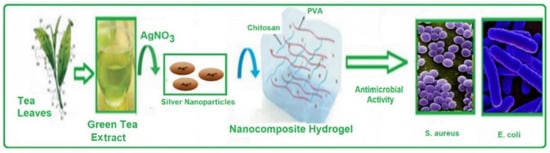 Hydrogel is a 3D network with an excellent water absorption characteristic which includes a high-swelling ratio (500–900%) and quick equilibrium. In tests using the Gram-negative bacterium, e.g., Escherichia coli, and the Gram-positive bacteria, e.g., Staphylococcus aureus, the hydrogels also demonstrated strong antibacterial action. Therefore, a method for the environmentally friendly creation of antibacterial hydrogels based on AgNPs produced locally and conveniently from tea leaves was developed [2,8].