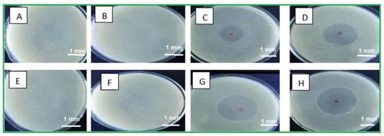 The inhibition zone for S1 (A,E), S1Ag (B,F), S1Ag0.3 (C,G), and S1Ag0.8 (D,H).