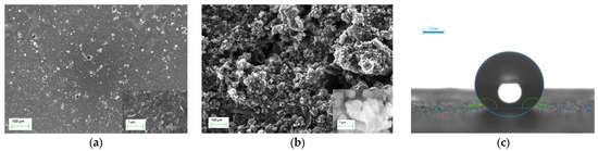 (a) Image of CB-ISM solid contact layer, illustration: 1 μm enlarged image; (b) image of POT-CB-ISM solid contact layer, illustration: 1 μm enlarged image; (c) POT-CB-ISM static contact angle image.