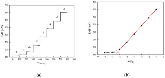 In the above test process, the prepared potassium ion selective electrode was activated in 10−3 M KCl solution for 24 h before use. The adjustment steps were repeated before each measurement, and all electrodes were adjusted and stored separately.