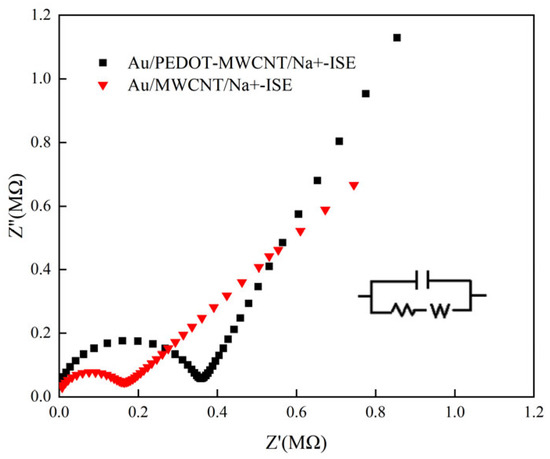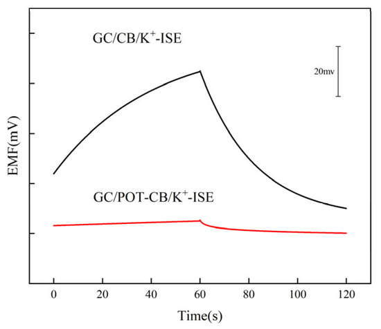 There is a semicircle in the impedance spectrum in the high frequency region. The semicircle is related to the bulk impedance of the ion-selective sensitive membrane, and also to the contact resistance of the solid contact layer and the interface of the ion-selective sensitive membrane [46]. From Figure 5, we can see that the high frequency resistance of GC/POT-CB/K+-ISE is about 0.091 MΩ, which is less than the resistance of GC/CB/K+-ISE (0.19 MΩ), indicating that the presence of POT-CB can reduce the resistance of electron transfer between the solid contact layer and the interface of the ion-sensitive membrane, and improve the rate of electron transfer at the interface. In the low frequency region, GC/POT-CB/K+-ISE has a large semicircle; in contrast, the semicircle of GC/CB/K+-ISE in low frequency region is significantly smaller. The main reason is that the existence of POT-CB improves the conductivity between the potassium ion electrode and the ion-sensitive membrane interface and further increases the double-layer capacitance of the electrode.