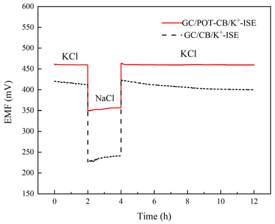 The open circuit potential method was used to measure the water layer and anti-interference performance of the electrode. The test results are shown in Figure 6. A continuous open-circuit potential test on GC/POT-CB/K+-ISE in 0.1 M KCl solution was carried out. After 2 h, the electrode was transferred to a 0.1 M NaCl solution for continuous testing for 2 h and then returned to a 0.1 M KCl solution for testing for 8 h. As shown in Figure 6, after transferring to the NaCl solution, the potential of GC/POT-CB/K+-ISE drops sharply, but the potential is still very stable. After returning to KCl solution, GC/POT-CB/K+-ISE keeps the initial potential value, without drift, and the potential is very stable. This shows that the super-hydrophobicity of the solid contact layer added with POT-CB can effectively avoid the appearance of an interfacial water layer, thus ensuring the excellent potential stability of the electrode