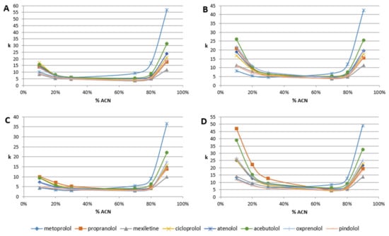 All β-blockers exhibit a U-shape of retention behavior over the mobile phase composition. The plots of retention factor (k) are presented in Figure 3. First, on all columns, all β-blockers exhibit significant retention, independent of the mobile phase composition. Usually, for polar-embedded stationary phases, for mobile phase composition in the range of 45–55% of organic modifier, there is a minimum of retention. In many cases, compounds in such conditions are eluted in or near the column void volume. Here, we can observe a retention factor of around five (for Diol-P-C-Benzyl and Diol-P-C18). It increases to around k = 7 for Diol-P-Chol (for a wide range of 30–70% of ACN). The lowest retention (around k = 4) is observed for Diol-P-C10. Detailed data on retention factors are listed in Table S1.