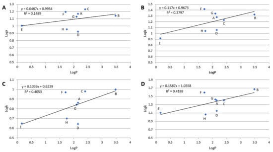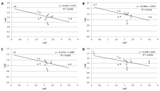 Dependences of log k vs. log P; (A)–Diol-P-Benzyl, (B)–Diol-P-C18, (C)–Diol-P-C10, and (D)–Diol-P-Chol measured for 10% ACN in 10 mM ammonium acetate in water. (A)–metoprolol, (B)–propranolol, (C)–ciciloprolol, (D)–mexiletine, (E)–atenolol, (F)–acebutolol, (G)–oxprenolol, and (H)–pindolol.