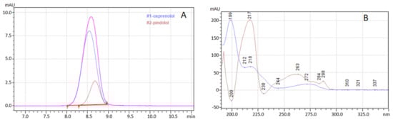 As usual, the optimization of RP HPLC analysis is the key to obtaining complete separation of β-blocker mixtures. The literature shows that these compounds’ most influential chromatographic parameters are the mobile phase composition (especially in buffer selection), pH, flow rate, and temperature [1,7,8,9,12]. β-blockers are protonated at low pH of the mobile phase [7]. Usually, the increase in β-blocker retention is observed when the pH of the mobile phase is increased to 6.5. The pH increase reduces the protonation, increasing the hydrophobicity [7,9]. Another critical parameter is the type of stationary phase and its particle size. Four compounds were separated in 25 min using 5 µm C18; however, changing the column to monolithic allowed the time to be reduced to 5 min (with an increased flow rate) [4,7]. Reducing the particle size of the C18 stationary phase to 3.5 µm allows the separation of a 5–8 component mixture of β-blockers in 10 min [6], while a further reduction to 1.7 µm provides separation of up to a dozen compounds in the same time [12].