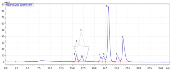 All the measurements were undertaken with the mobile phase’s 1 mL/min flow rate. The column thermostat was set to 30 °C, while the autosampler temperature was set to 5 °C. The injection volume was 1 µL for the analysis of single components and 10 µL for mixtures. Measurements were made in triplicate.
