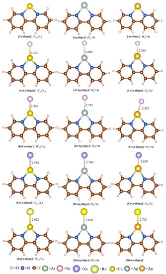 Among the bonding of noble gas atoms with other elements of the periodic table, the ones with the noble (or precious) metals, i.e., Cu, Ag, and Au, are of particular interest to us due to the challenges that come with attempting bond formation between two less reactive elements. Research in this field essentially came to the forefront with Pyykkö’s prediction of complexes containing Ng and Au [25,26], followed by pioneering works by several groups in detecting complexes with noble gases and noble metals interacting with each other [29,41,42,43,44,45,75].