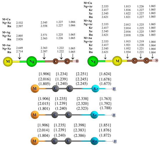 Optimized geometries of the insertion MNgCCH, non-insertion NgMCCH, and MCCNgH complexes, along with the respective bond distances (in Å) for the concerned bonds. The values within the parenthesis, braces, and square brackets are computed for Cu, Ag, and Au, respectively. [Reprinted from Refs. [86,87] with permission from American Chemical Society. © 2017 and © 2018, American Chemical Society, respectively].