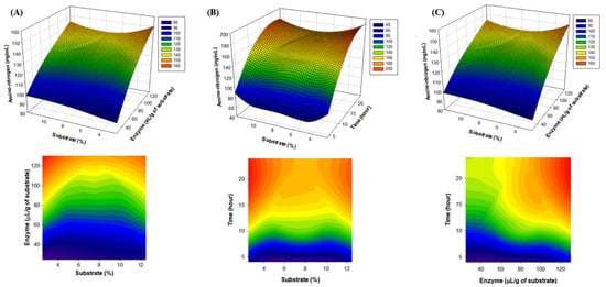 Response surface methodology (RSM)-run 3D graph. (A) Substrate (%), enzyme (μL/g of substrate), and amino-nitrogen (μg/mL) 3D graph. (B) enzyme (μL/g of substrate), time (hour), and amino-nitrogen (μg/mL) 3D graph. (C) Substrate (%), time (hour), and amino-nitrogen (μg/mL) 3D graph.