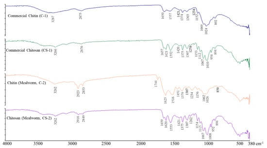 FT-IR spectrophotogram of commercial chitin (C-1), chitosan (CS-1), chitin (C-2), and chitosan (CS-2) from mealworm larvae.