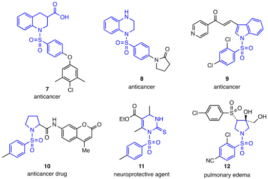 The formation of sulfonamides as intermediates in the current reaction is also of interest, as this family of compounds constitutes an important class of drug compounds with wide-ranging activities. Several experimental drug compounds are pictured in Figure 1. The tetrahydroquinoline sulfonamide 7 was found to impede the development and progression of several cancers by inhibiting the antagonist activity of myeloid cell leukemia-1 toward pro-apoptotic Bcl-2 proteins [19]. Phenylpyrrolidine sulfonamide 8 in conjunction with Doxorubicin showed antiproliferative activity against breast cancer cells both in vitro and in xenograft models [20]. Indole sulfonamide 9 inhibited the carbonic anhydrase IX isoform, possessed anti-proliferitive potential, and significantly increased apoptosis in breast cancer cells [21]. Coumarin-proline sulfonamide 10 proved to be active against breast cancer cells, and its inhibition of dipeptidal peptidase IV suggested that compound hybrids incorporating this functional triad might have potential in the treatment of type II diabetes [22]. Heteroaryl sulfonamide 11 exhibited neuroprotective effects via the inhibition of human carbonic anhydrase I and II, which may yield a new strategy for the treatment of Alzheimer’s disease [23]. Finally, pyrrolidinediol 12 proved effective in reversing pulmonary edema and increasing arterial oxygenation, lowering the chances of death in congestive heart failure patients through antagonism of the transient receptor potential vallinoid-4 (TRPV4) cation channel [24]. Although most sulfonamides are prepared via reaction of a sulfonyl chloride with a primary or secondary amine or alkylation of a pre-existing sulfonamide [25], the scheme outlined in this report represents a unique variation on double alkylation of a primary sulfonamide.