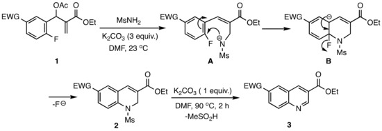 The original project aimed to add methanesulfonamide to MBH acetates 1 derived from benzaldehydes activated by electron withdrawing groups (EWG) toward SNAr cyclization via Michael-initiated SN2’ intermediate A and Meisenheimer complex B to give tertiary cyclic sulfonamides 2. In the second step, the plan was to eliminate the mesyl group to generate 3,6-disubstituted quinoline derivatives (Scheme 1). Such eliminations were first observed by Kim and co-workers [17] from 1-p-tosyl-1,2-dihydroquinolines derived from p-tosylamido MBH adducts. During our study, however, it was found that this process only proceeded using dihydroquinolines incorporating C-3 esters and nitriles but failed when a C-3 acetyl group was present.