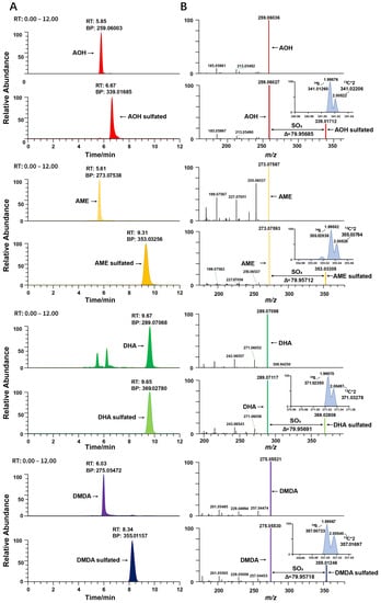 - Soukup, S.T.; Kohn, B.N.; Pfeiffer, E.; Geisen, R.; Metzler, M.; Bunzel, M.; Kulling, S.E. Sulfoglucosides as Novel Modified Forms of the Mycotoxins Alternariol and Alternariol Monomethyl Ether. J. Agric. Food Chem. 2016, 64, 8892–8901. [Google Scholar] [CrossRef]