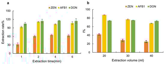 Influence on the I% of AFB1, ZEN and DON of (a) different extraction times of 1, 2, 4 and 6 min; and (b) different extraction volumes of 20, 30 and 40 mL.