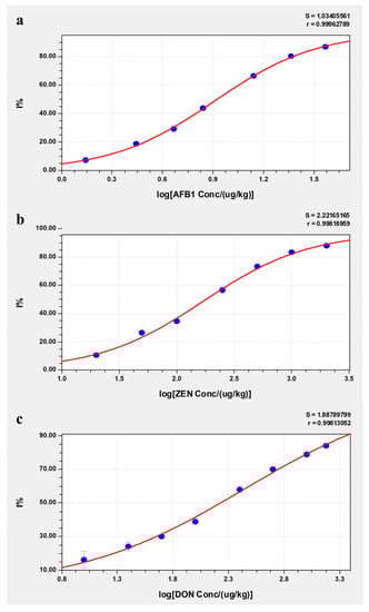 The standard curves for detecting AFB1, ZEN and DON in corn flour are shown in Figure 3. The standard curves of AFB1, ZEN and DON were based on the four-parameter logistic equation, and the working ranges were from 1.51 μg/kg to 40 μg/kg, 20 μg/kg to 2000 μg/kg and 35 μg/kg to 1500 μg/kg, respectively. The LODs of AFB1, ZEN and DON were 0.90 μg/kg, 7.11 μg/kg and 10.6 μg/kg, respectively. The LOQs of AFB1, ZEN and DON were 1.51 μg/kg, 20.3 μg/kg and 35.4 μg/kg, respectively. The maximum residue limits were 20 μg/kg for AFB1, 60 μg/kg for zearalenone and 1000 μg/kg for deoxynivalenol in cereals and their processed products [35], all within the working range of the three standard curves of AFB1, ZEN and DON in this study. As the residue limits of AFB1, ZEN and DON are quite different, the extracts must be diluted for detection at different ratios for different mycotoxins in other studies [36,40]. However, the method developed in this study can simultaneously extract three mycotoxins directly from grains without dilution for detection. Therefore, this approach simplifies the operation process and is easier for nonprofessional users, which can help realize on-site testing and home testing.