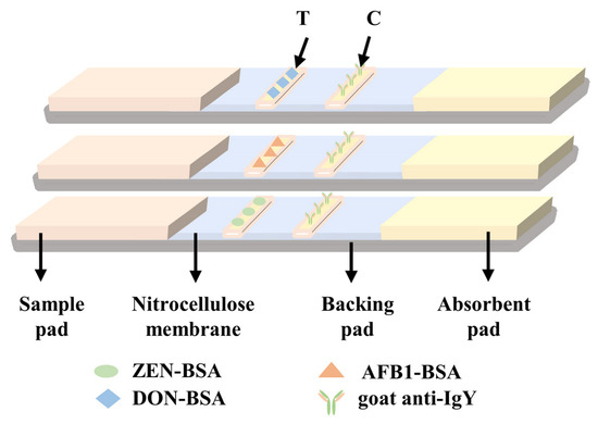 Schematic representation of the immunochromatographic test strip for AFB1, ZEN and DON.