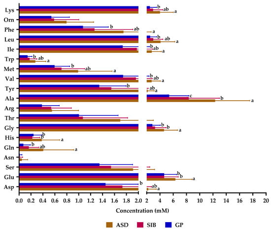 Fecal levels of amino acids in samples from autistic children (ASD), their siblings (SIB), and children from the general population (GP) in Tunisia. Asp: aspartate; Glu: glutamate; Ser: serine; Asn: asparagine; Gln: glutamine; His: histidine; Gly: glycine; Thr: threonine; Arg: arginine; Ala: alanine; Tyr: tyrosine; Val: valine; Met: methionine; Trp: tryptophan; Ile: Isoleucine; Leu: leucine: Phe: phenylalanine; Orn: Ornithine; Lys: lysine. Bars represent mean values and horizontal lines on the bars represent standard deviation. Different letters (a, b, ab, c) indicate significant differences among groups of children for each amino acid (p < 0.05).