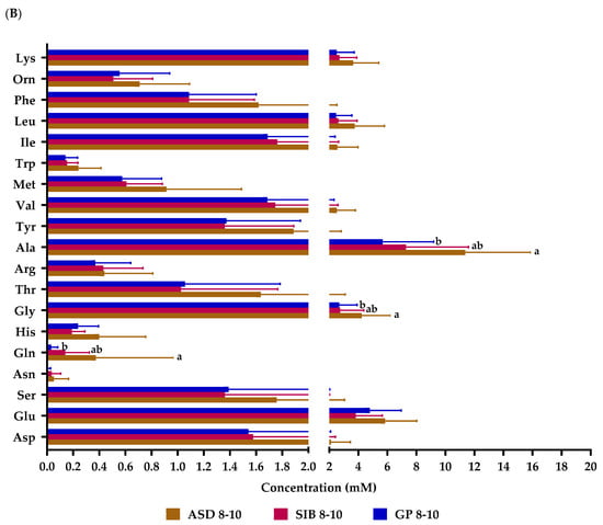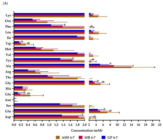 Fecal levels of amino acids in samples from autistic children (ASD), their siblings (SIB), and children from the general population (GP) in Tunisia stratified by age: (A) 4–7 years, (B) 8–10 years. Asp: aspartate; Glu: glutamate; Ser: serine; Asn: asparagine; Gln: glutamine; His: histidine; Gly: glycine; Thr: threonine; Arg: arginine; Ala: alanine; Tyr: tyrosine; Val: valine; Met: methionine; Trp: tryptophan; Ile: Isoleucine; Leu: leucine: Phe: phenylalanine; Orn: Ornithine; Lys: lysine. Bars represent mean values and horizontal lines on the bars represent standard deviation. Different letters (a, b, ab) indicate significant differences among groups of children for each amino acid (p < 0.05).