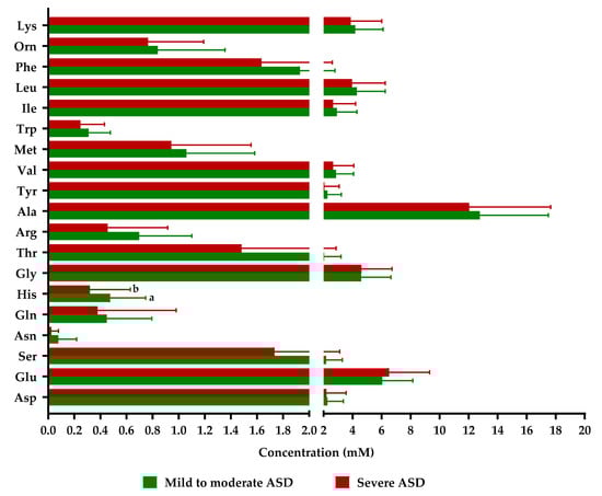 Fecal levels of amino acids in samples from autistic children (ASD), stratified by severity of the disease according to CARS score: mild to moderate (30–36) and severe (37–60). Asp: aspartate; Glu: glutamate; Ser: serine; Asn: asparagine; Gln: glutamine; His: histidine; Gly: glycine; Thr: threonine; Arg: arginine; Ala: alanine; Tyr: tyrosine; Val: valine; Met: methionine; Trp: tryptophan; Ile: Isoleucine; Leu: leucine: Phe: phenylalanine; Orn: Ornithine; Lys: lysine. Bars represent mean values and horizontal lines on the bars represent standard deviation. Different letters (a, b) indicate significant differences between groups of children for each amino acid (p < 0.05).