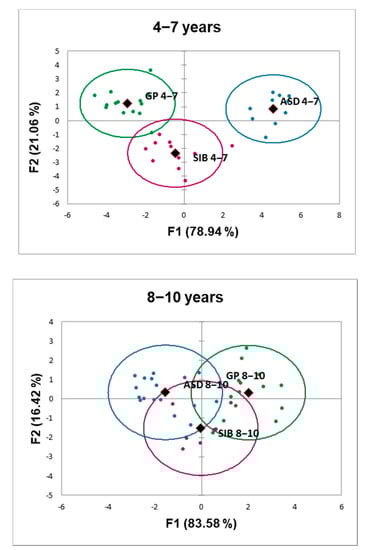 At the age of 4–7 years, the LDA returned two canonical functions: F1 explained 78.94% of variance (eigenvalue 10.391) and F2 explained 11.34% of variance (eigenvalue 2.772). The correlations of variables to discriminant functions (Table S2) indicated that the main contributors to F1 in a decreasing order were alanine (coefficient: 0.669), tyrosine (coefficient: 0.662), glutamine (0.599), tryptophan (0.549), glycine (0.536), phenylalanine (0.536), and valine (0.531). The main contributors to F2 were asparagine (coefficient: 0.259) and histidine (coefficient: 0.143). Figure 4 plots F1 vs. F2. The first function clearly separated members of the ASD group from members of the other two groups; whereas, F2 provided a good separation between GP and SIB, with only one member of the GP group being clustered with SIB. On the other hand, considering the means of metabolic parameter values for each group, the probability of individuals for being allocated in the correct group was 100% for ASD and SIB and 92.86% for GP.