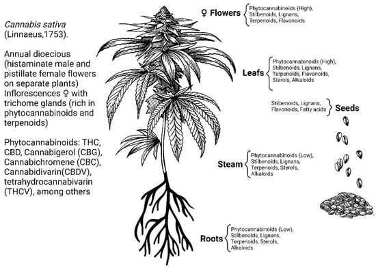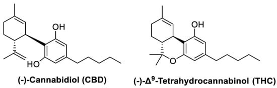 The herbaceous plant, Cannabis sativa (Linneo, 1753), has been known and used for thousands of years for recreational, religious, and medicinal purposes. The most ancient record of the use of this plant as a medicine is found in the world’s oldest pharmacopeia, the Pen-ts’ao ching (China, 2737 BC) [1,2]. This plant contains many secondary metabolites including terpenoids, flavonoids, alkaloids, lignans, fatty acids, and a large number of components (approximately 120) with a hybrid biogenetic origin involving mevalonate and polyketide pathways, which are exclusive to the plant and are named phytocannabinoids (Figure 1) [3,4,5]. The two major phytocannabinoids isolated from C. Sativa L. are: (-)-trans-Δ9-tetrahydrocannabinol (Δ9-THC) and (-)-cannabidiol (CBD), (Figure 2) both of which have been studied for their therapeutic potential [6,7]. Δ9-THC was discovered in 1964 and is recognized as the primary psychoactive compound responsible for the behavioral effects induced by the consumption of C. sativa preparations, such as marijuana or hashish [8]. It has been demonstrated that Δ9-THC shares behavioral effects like those of other drugs of abuse in drug reinforcement animal models [9]. Moreover, Cannabis-related use disorder is acknowledged in the Diagnostic and Statistical Manual of Mental Disorders (DSM 5). The study of this molecule led to the further discovery of an important neuromodulatory system widely distributed throughout the brain and body, identified as the endocannabinoid system.