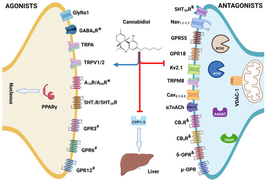CBD is a complex multi-target molecule, meaning that it can exert different pharmacological effects by interacting with highly diverse molecular targets. CBD behaves as an agonist (Table 2), inverse agonist, or antagonist (Table 3) on different receptors. CBD can also behave as an allosteric negative (NAM) or positive (PAM) modulator. CBD also exerts an effect on several enzymes, both neuro-enzymes and hepatic ones. CBD’s effects have been reported to vary across concentrations and doses in vitro and in vivo models (Figure 3). First, we review the effects of CBD on ion channels, followed by the effects of CBD on metabotropic receptors, concluding with the effects of CBD on neuro-enzymes that metabolize and regulate neurotransmission systems. Because of its relevance, the literature about the effects of CBD on hepatic enzymes is also briefly considered. This section will be divided by subheadings and provide a concise and precise description of the experimental results, their interpretation, as well as the experimental conclusions that can be drawn.