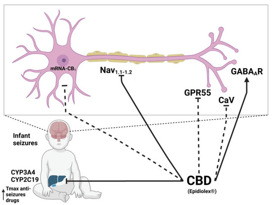 The modulation of ionic currents of ion channels such as GABAAR [41], Nav [71,72], and less documented Cav [75] might be important in the anticonvulsant and antiepileptic effect of CBD. First, the combined effect of CBD with clobazam (CBD acts as PAM on GABAAR) [41] has an important role in the suppression of common epileptic events by maintaining homeostasis over brain excitation and its importance for treating drug-resistant epilepsy caused by mutations that alter the channel [170]. Secondly, the target of CBD to treat DS is the non-specific inhibitory effect on the mutated sodium channels Nav1.1 and Nav1.2 [73,74]; although, it is also capable of inhibiting other sodium channels such as Nav1.3, Nav1.4, Nav1.5, Nav1.6, and Nav1.7 [71,72]. However, a very important factor that enhances the inhibition of GABAA and sodium channels by CBD is its inhibitory effect on CYP1, CYP2, and CYP3 liver enzymes, such as CYP3A4 and CYP2C19 enzymes, which are necessary for the degradation of anticonvulsant drugs such as clobazam and its metabolite N-desmethylclobazam, leading to an increase in their Tmax values and plasma half-life [41]. In addition, the antiepileptic effect of CBD is associated with the inhibition of the GPR55 receptor, thus increasing the release of neurotransmitters as shown in an epilepsy mouse model [169] and by reducing the expression of the CB1 receptor [163], although their mechanism of action is not clearly defined for these two receptors (Figure 4).