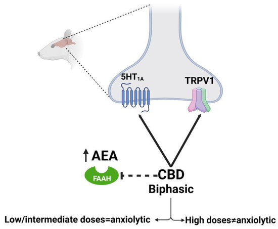 Regarding neuropsychiatric disorders, some of the effects are well described, but the characterization of how CBD can exert them throughout the molecular target or targets is still a matter of debate. Experimental demonstrations are required as well as the exploration of other potential targets. The anxiolytic effects of CBD have been extensively demonstrated in clinical and preclinical studies (for reviews see [192,193,194,195]). The mechanism of action throughout CBD that can reduce anxiety seems to be complex and dose dependent. Accumulated evidence indicates that acute administration of CBD produces a typical ‘bell-shaped’ dose–response curve, being anxiolytic just at low-moderate doses but not at high doses [160]. The anxiolytic effects seem to be mediated by the ability of CBD to act as a 5-HT1AR agonist, since the reduction in anxiety-like parameters induced by CBD is blocked by a specific 5-HT1AR antagonist [110,111,154,159]. It must be taken into consideration that while in vitro studies suggest CBD acts as a direct 5-HT1A receptor agonist [108], in vivo studies are more consistent with CBD acting as a PAM, hence facilitating 5-HT1AR signaling [112]. On the other hand, it has been proposed that the lack of anxiolytic effect of the high doses of CBD is related to the activation of TRPV1 receptors, since blocking TRPV1 centrally allows for high doses of CBD to be effective [160]. Another proposed mechanism is by the indirect potentiation of AEA transmission since CBD can inhibit the FAAH enzyme [155] (Figure 5). This could be related to a recent study that demonstrated that CB1R (but not CB2R or GPR55-KO mice models) is relevant in modulating the anxiolytic actions of CBD using knockout mice for these receptors [158]. It is possible that these mechanisms and other ones can be acting in conjunction, since CBD can interact with other receptors involved in the regulation of anxiety such as GABAAR.