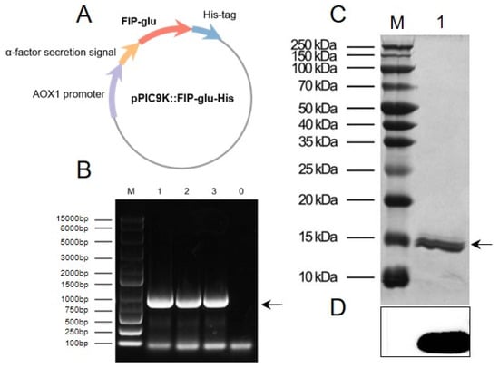 Preparation of rFIP-glu in Pichia pastoris. (A) Construction of the recombinant plasmid pPIC9K::FIP-glu-His. (B) Identification of yeast transformants by PCR analysis. Lane M, DNA Ladder; Lane 1–3, rFIP-glu yeast transformant DNA; Lane 0, negative control. (C) SDS-PAGE analysis. Lane M, molecular weight marker; Lane 1, rFIP-glu. (D) Western blot analysis.