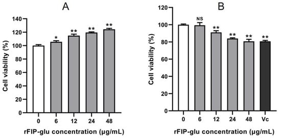 Safety evaluation. The effects of rFIP-glu on the cell viability of (A) HaCaT cells and (B) B16 cells. Vc (40 μg/mL) was used as the positive control. Data are expressed as means ± SD (n = 3). NS, p > 0.05; *, p ≤ 0.05; **, p ≤ 0.01 versus the control group.